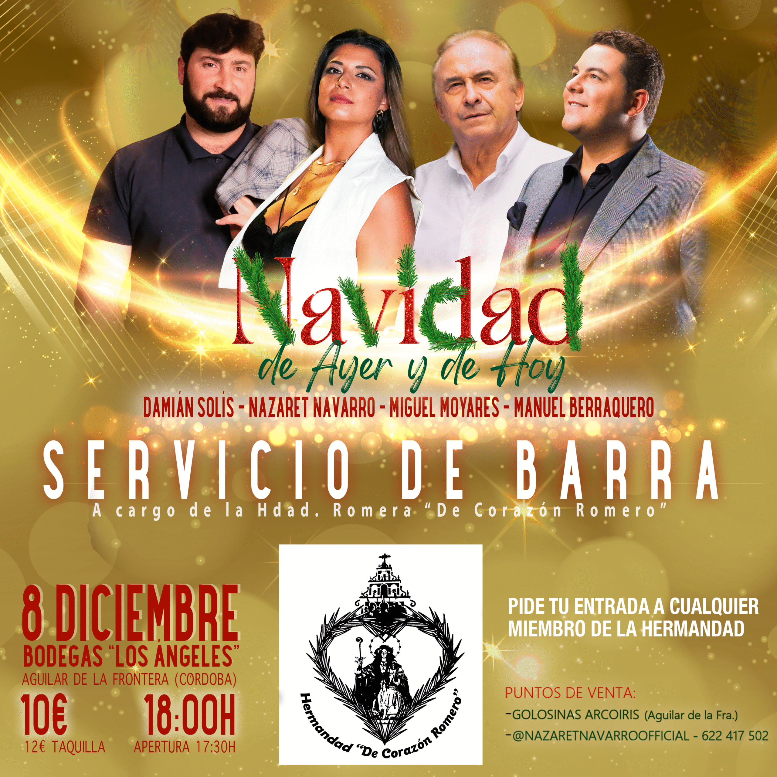 El próximo 8 de diciembre se celebrará en la localidad cordobesa de Aguilar de la Fra. (Córdoba) un concierto navideño formado por un gran elenco de artistas como son: Miguel Moyares de Ecos del Rocío, Nazaret Navarro, Damián Solís y Manuel Berraquero